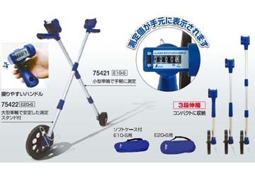 Bánh xe đo có đường kính khác nhau đi kèm với tay cầm có thể điều chỉnh chiều cao, dùng để đo khoảng cách bằng cách đi bộ thay cho cách đo thông thường. Các loại bánh xe điển hình như: đường kính 4" (10cm) để sử dụng trong nhà, 10" (25cm), và 19" (45cm) cho địa hình ngoài trời. Sản phẩm hiển thị chỉ số đo theo hệ inh và hệ mét, trọng lượng khá nhẹ, dễ di chuyển khi ra ngoài công trường.